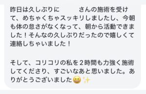 久々に受けていただき、凝り固まったお身体が軽くなり活動しやすくなったなんて