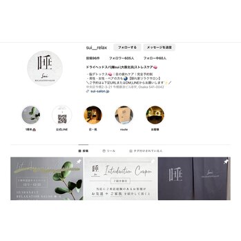 睡はSNS、主にInstagram「sui__relax」の方をしており、ありがたい事にSNSを見てお客様にご来店頂ける事が沢山あります(*´ `*)